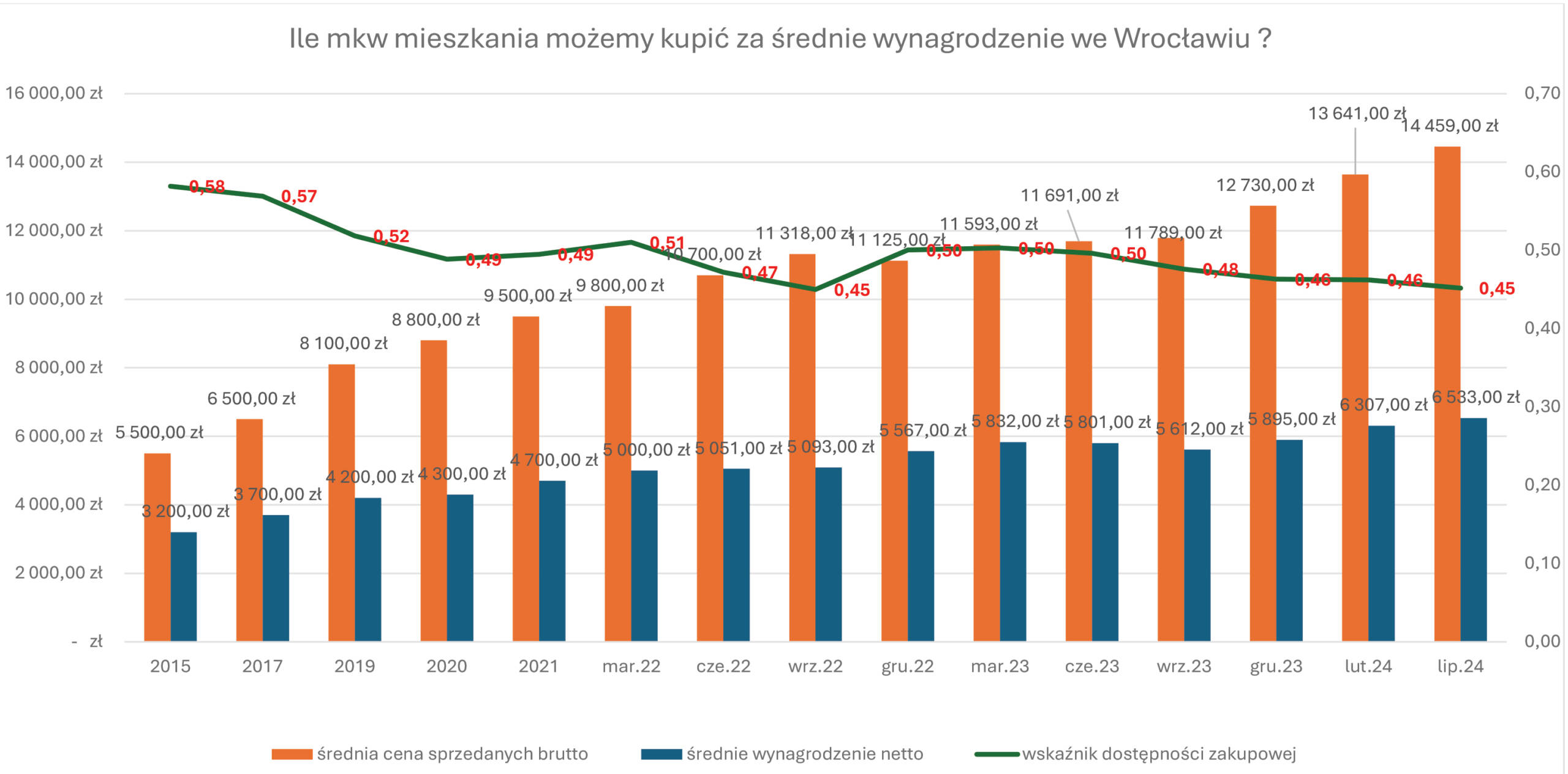Dane nie napawają optymizmem. W oparciu o średnie wynagrodzenie GUS dla miasta Wrocławia jego przeciętny mieszkaniec może pozwolić sobie na zakup 0,45 mkw. Niestety jest to tendencja malejąca. W latach 2019 – 2023 zauważyć możemy widoczną średnią w okolicach 0,5 mkw. Od ubiegłego roku zdolność do zakupu spadła zatem o blisko 10%.