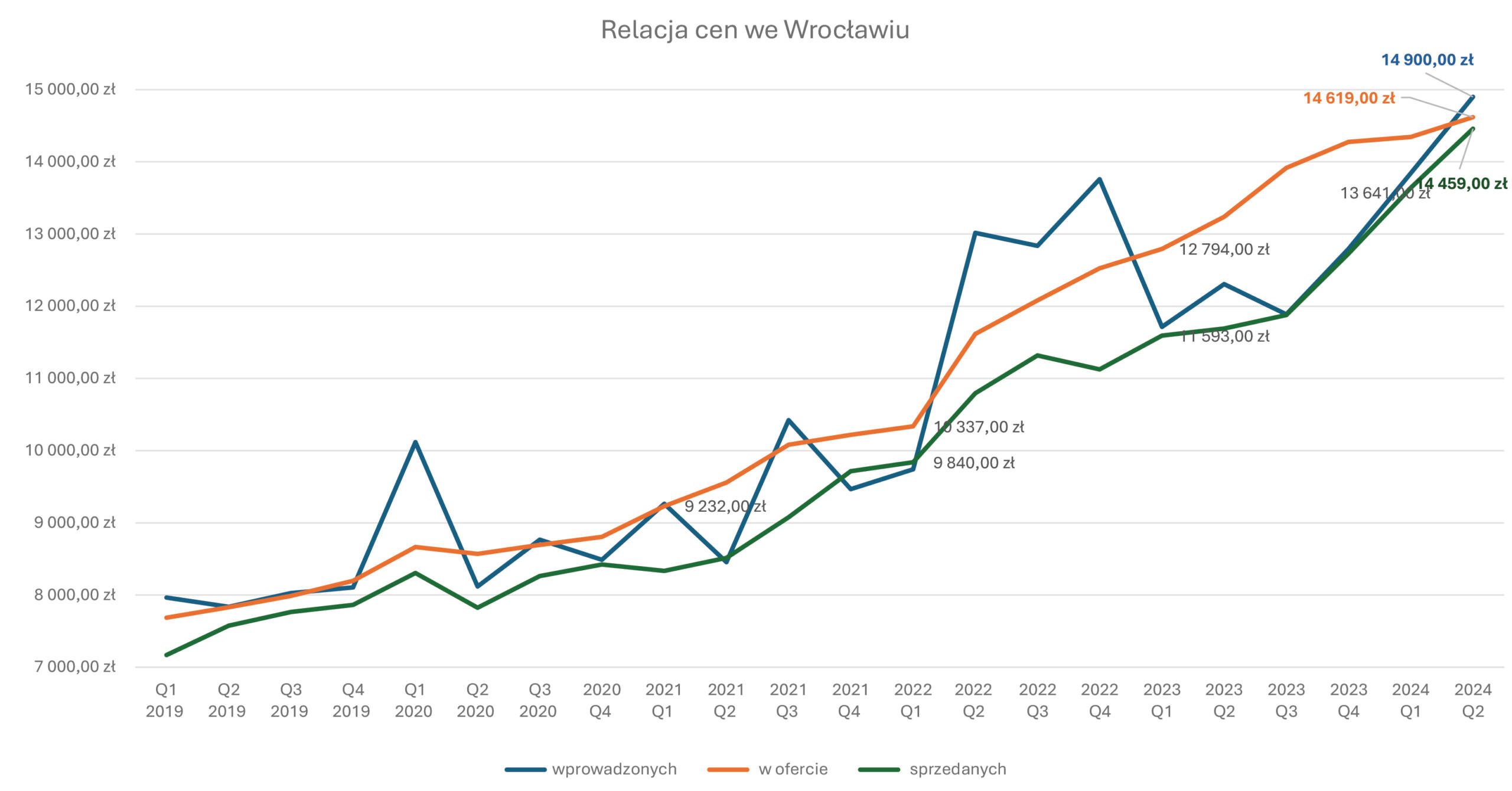 Relacja cen mieszkań wprowadzanych , ofertowych oraz tych sprzedanych cały czas rysuje trend wzrostowy w przedziale od 1 do 7% i to tylko w ujęciu kwartalnym dla wskazanych zakresów.